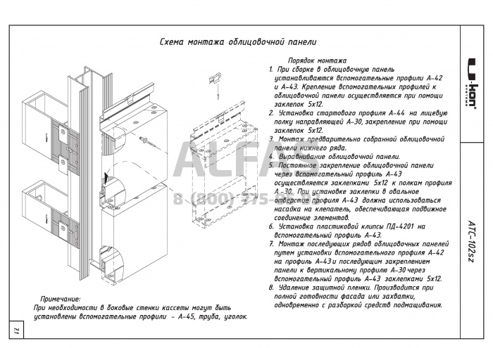 Облицовочные панели представляют собой готовые кассеты, в горизонтальные отгибы которых, перед монтажом устанавливается несущий профиль.